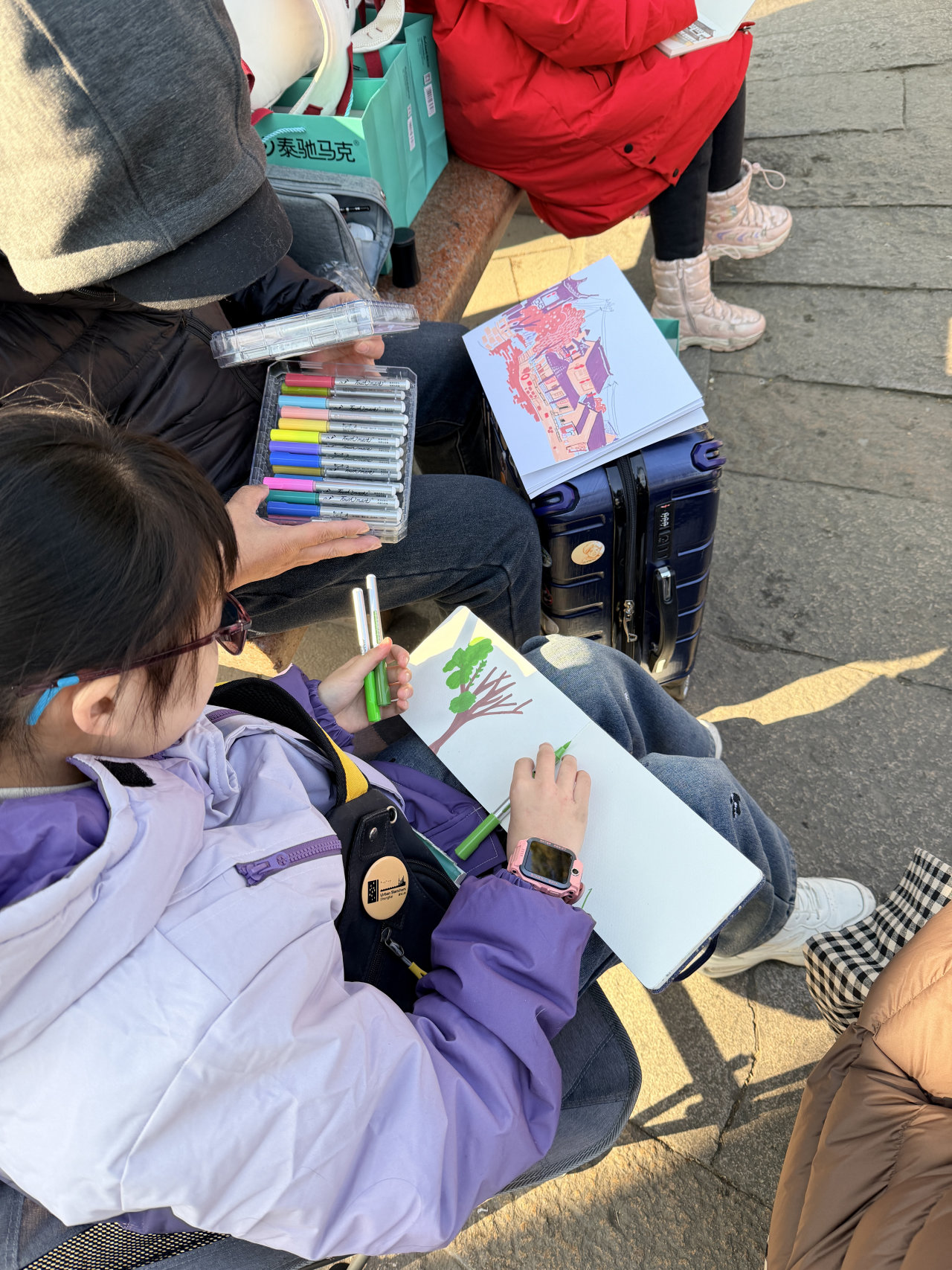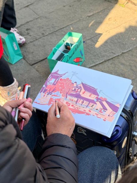 活动现场,10位专业速写艺术家领衔带队,社会各界漫画爱好者与学生齐聚古镇旅游公司入口集结签到,领取Touchmark定制速写本与画笔套装后,通过彩色贴纸分组破冰交流。随后大家沿3条不同特色路线出发,在古桥流水、深巷古宅间驻足写生,艺术家现场示范构图与线条运用技巧,搭配专业导游的文化讲解,让创作更具深度。